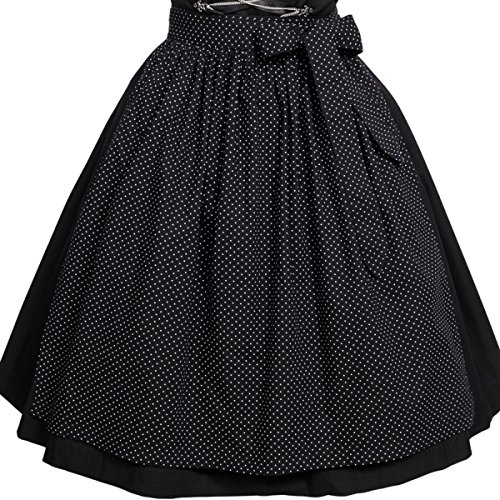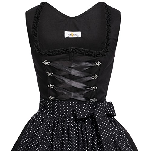 Qualität wird bei Almsach groß geschrieben. Dieses Midi-Dirndl ist einer der BEST-PRICE Klassiker von Almsach. Das schwarze Dirndlkleid wirkt auf den ersten Blick schlicht, die Hakenschnürung und das im Lieferumfang enthaltene schwarze Satinband verleihen dem Dirndl zeitlose Eleganz. Dazu trägt auch die extravagante Borte und die schwarze Schürze mit weißen Punkten bei. Die Schürze können Sie natürlich wechseln und nach Belieben variieren. Zu diesem praktischen Model mit Einschubtasche auf der rechten passt jede Dirndlschürze und Taftschürze.Ein weiterer großer Vorteil bei diesem Dirndl ist, dass es nach einem anstrengenden Wiesnbesuch auf dem Oktoberfest einfach in der Maschine bei 30 Grad Platz nimmt und so – vielleicht sogar schon am nächsten Tag – ihrer Besitzerin wieder frisch und sauber große Freude beim Tragen bereiten kann. Die klassische Hakenschnürung rundet das Gesamtbild ab. Das Dirndl ist 60 Zentimeter lang.Hinweis zur Abbildung: Sofern nicht anders beschrieben, werden unsere Dirndl ohne Dirndlbluse geliefert. Dirndl und Bluse können Sie bei uns in verschiedenen Größen bestellen, so passt die Tracht perfekt. Unser Tipp: Variieren Sie z. B. zwischen weißen und schwarzen Dirndlblusen, viele unserer Dirndl können mit beiden Farben und verschiedenen Dirndlblusen (z. B. Langarmbluse, Kurzarmbluse) getragen werden. Zudem können fast alle unsere Dirndl für kleines Geld (ca. 15 Euro) beim Schneider angepasst werden wenn es einmal nicht passt. So wird ein wunderschönes Dirndl zu Ihrem perfekt sitzenden Dirndl Unikat!