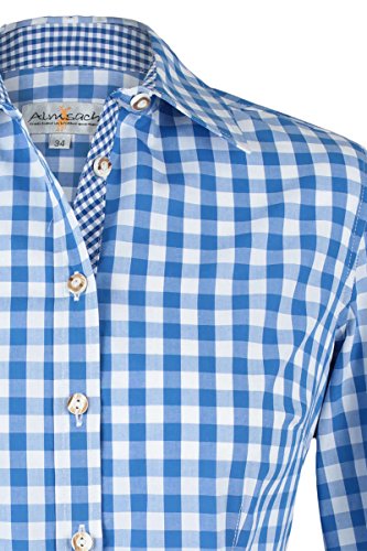 Diese klassische grob karierte weiß-blaue Bluse aus 100% Baumwolle ist ein absolutes Basic und gehört in jeden Kleiderschrank. Die Taillenabnäher und die Rückenpasse garantieren den perfekten Sitz. Die Knopfleiste, die im Kragen mündet, der Kragen selbst und die Ärmelmanschetteninnenseiten sind mit feinem weiß-blauen Karo eingefasst. Die Knöpfe der Bluse sind in Hirschhornoptik gehalten.