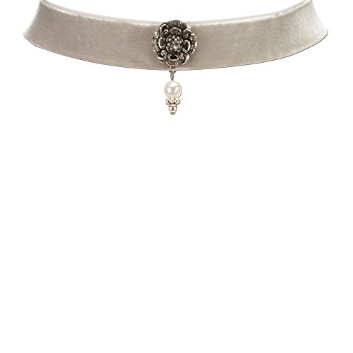 Alpenflüstern Trachten-Samt-Kropfband Frida mit Ornament und Perle – nostalgische Trachtenkette enganliegend, Kropfkette elastisch, Damen-Trachtenschmuck, Samtkropfband breit grau DHK168