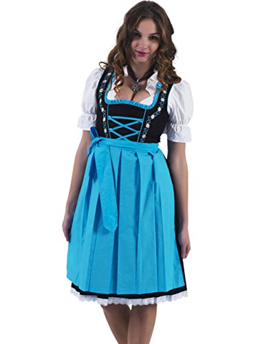 Das 3-teilige Dirndl-Set besteht aus einem schwarzen Kleid mit einem gerade ausgeschnittenen Oberteil, einer feinen Edelweiss-Stickerei und einem farblich passenden Band zum schnüren. Im Angebot enthalten sind ausserdem eine türkise Schürze aus Baumwollstoff und eine weisse Bustierbluse mit kurzen Puffärmel, die bis unter die Brust reicht und durch einen eingearbeiteten Tunnelzug individuell geschnürt werden kann. Das Dirndlkleid hat eine Gesamtlänge von ca. 105 cm und eine Rocklänge von ca. 65 cm. Material * Kleid: 100% Baumwolle * Bluse und Schürze: 100% Baumwolle