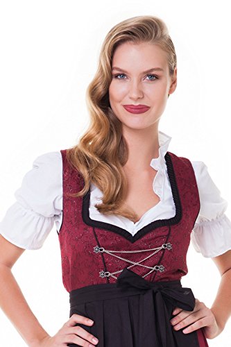Das 3-teilige Dirndl-Set besteht aus einem rot- schwarzen Kleid mit einem herzförmig ausgeschnittenen Oberteil und einer Kette zum schnüren. Im Angebot enthalten sind ausserdem eine schwarze Baumwoll-Schürze und eine weisse Bustierbluse mit kurzen Puffärmeln, die bis unter die Brust reicht und durch einen eingearbeiteten Tunnelzug individuell geschnürt werden kann. Das Dirndlkleid hat eine Gesamtlänge von ca. 140 cm und eine Rocklänge von ca. 100 cm. Dieses elegante Dirndl kann nicht nur zum Oktoberfest, sondern auchgut zu anderen Anlässen getragen werden.