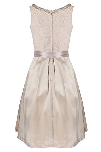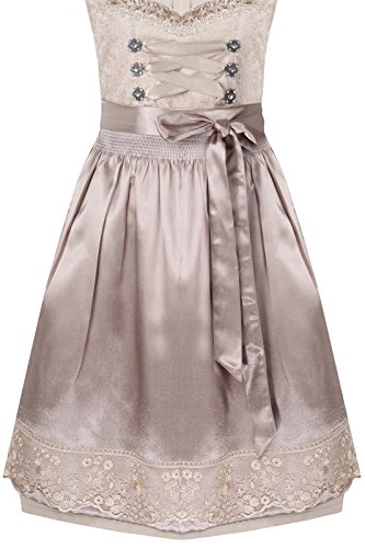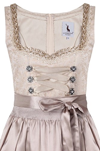 Das elegant-klassische Midi Dirndl aus der exklusiven Kollektion von Alpenmärchen ist mit seiner Farbgebung in aparten Cremetönen ein echter Augenfang. Das edle Oberteil besticht durch eine aufwendige Froschmaulbordüre, wunderschön glänzende und mit Steinchen besetzten Miederhaken und ein feines Satinband zum Schnüren. Der feminine Look wird noch durch den zarten Spitzensaum an der Satinschürze unterstrichen. Die Rocklänge beträgt 60 cm. Eine passende Bluse ist nicht im Lieferumfang enthalten.