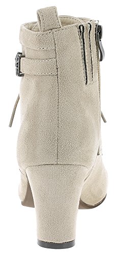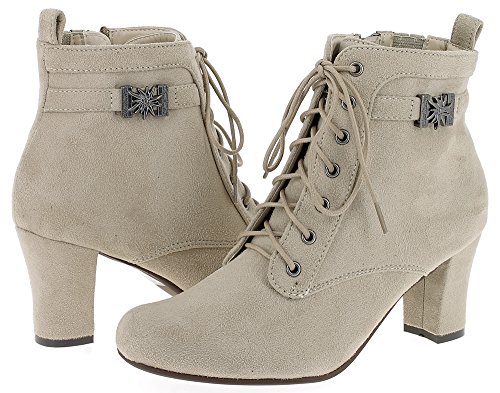 Auf geht´s zum Oktoberfest oder zur Kirchweih! Mit diesen tollen Stiefeletten Mara in hellem Beige von Hirschkogel haben Sie einen schicken und bequemen Begleiter. Diese toll verarbeiteten Absatzschuhe sind im traditionellen Wildlederlook gearbeitet und besitzen an der Seite eine Edelweiß Verzierung. Die Trachtenschuhe können geschnürt, aber auch mit dem seitlich angebrachten Reißverschluss geschlossen werden. Die Höhe des Absatzes beträgt ca. 7 cm und die Gesamthöhe der Stiefelette ca. 19 cm. Hochwertige Qualität und Verarbeitung zeichnen diese Schuhe aus. Der beigefarbene Damen Schnürschuh ist vielseitig kombinierbar zu Dirndl, Lederhose oder Jeans. Ein Muss für jeden Trachtenfreund, aber auch für die Freizeit ein toller Schuh. Hersteller: Hirschkogel Lieferumfang: 1 Paar Trachten Stiefeletten Obermaterial: Microfiber Innenmaterial: Leder / Textil Material Absatzhöhe: ca. 7 cm Gesamthöhe: ca. 19 cm Farbe: Beige