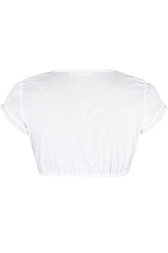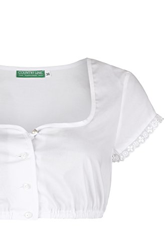 Diese weiße Bluse verfügt über einen niedlichen nahezu eckigen Ausschnitt der Ihr Dekolleté vorteilhaft zur Geltung bringt. Geschlossen wird die Bluse vorne mit drei kleinen Knöpfen und einem Kugelknopf der sich an oberster Stelle befindet. Am Saum der Bluse ist ein Gummizug angebracht. Die Ärmel der Bluse sind am Saum mit einer breiten weißen Spitzenbordüre geziert. Der Mix aus Polyester und Baumwolle ermöglichen einen hohen Tragekomfort sowie einfache Pflege der Bluse. Am besten die Bluse direkt nach dem Waschen nass auf einen Bügel hängen und trocknen lassen. Somit ist ein Bügeln nicht notwendig. Tipp: Die Bluse auf links gedreht aufhängen, so entstehen beim Trocknen keine „Hörnchen“ durch den Bügel. Diese Bluse lässt sich gut zu einem klassischen Dirndl kombinieren. Auch eine Trachtenjacke und ein Trachtencollier runden das Erscheinungsbild harmonisch ab.