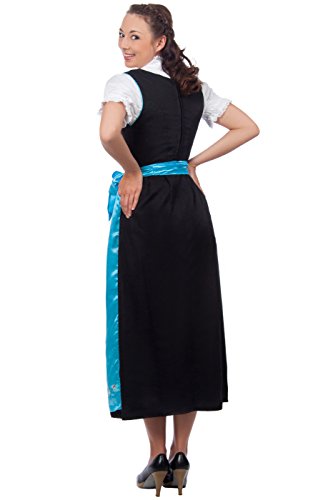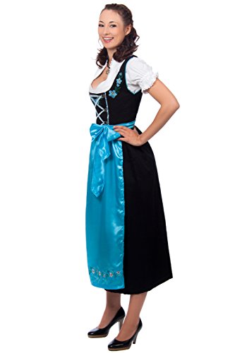 Langes Dirndl 3-teilig in schwarz mit passender weißer Bluse und blauer Schürze Am Oberteil befindet sich eine auffällige Blumenstickerei, farblich passend zur blauen Satinschnürung und blauen Satin Dirndlschürze An den Aussenseiten des Oberteils befindet sich jeweils eine blaue Paspel. Das Dirndel wird hinten mit einem Reisverschluss geschlossen und wird vorne mit blauen Satinbändern enger geschnürt, welche in silbernen Edelweiß Haken eingefädelt werden. Die glänzende Schürze des Trachtenkleid ist unten ebenfalls mit einer hochwertigen Blumenstickerei versehen. Dieses wunderschöne, moderne Dirndl lang ist ein echter Hingucker!