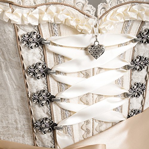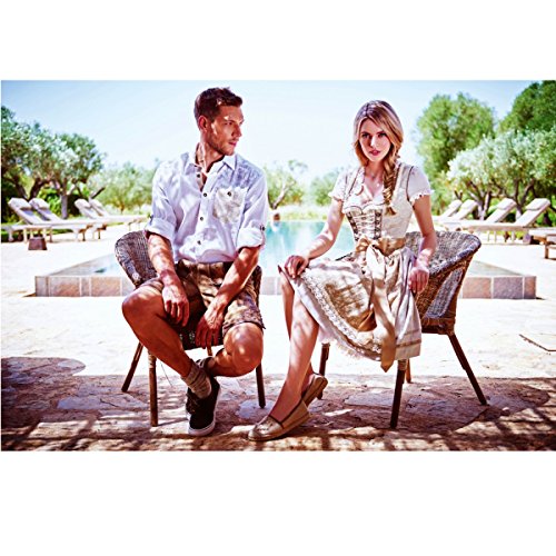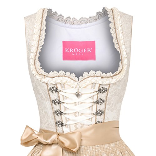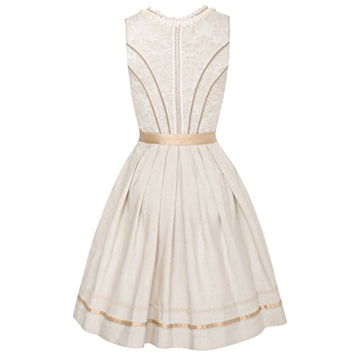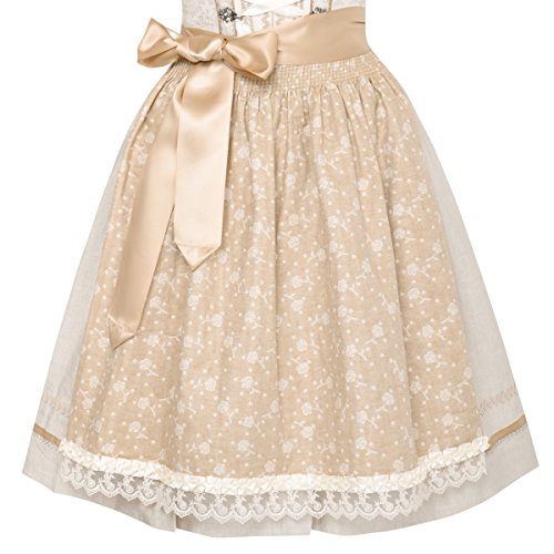 Ein elegantes midi Dirndl Linda in Beige aus dem Hause Krüger Dirndl. Das Dirndl Linda ist ein tolles Beispiel für die Kombination Klassik und Modern! Das Mieder ist ein Leinengemisch in das ein florales Muster verarbeitet wurde. Klassische Goscherl und elegante Spitze säumen Ausschnitt und Kragen. Parallel zu den Miederhaken verlaufen weitere Borten, unter anderem in einer silbrigen Metallicerscheinung. Der Zipper vom Reisverschluss ist mit einem liebevollen, herzörmigen Anhänger versehen, der ideal zu den Miederhaken passt. Die Dirndlschürze ist mit einem hellbraunen Schleifenband versehen und zeigt ein Rosenblütenmuster auf, welches in die Schürze eingearbeitet wurde und schließt mit Goscherln und eleganter Spitze ab. Der schlichte Dirndlrock ist im unteren Bereich ebenfalls mit hübschen Borten und Spitze versehen. Dieser misst eine Länge von 60 Zentimetern.Hinweis zur Abbildung: Sofern nicht anders beschrieben, werden unsere Dirndl ohne Dirndlbluse geliefert. Dirndl und Bluse können Sie bei uns in verschiedenen Größen bestellen, so passt die Tracht perfekt. Unser Tipp: Variieren Sie z. B. zwischen weißen und schwarzen Dirndlblusen, viele unserer Dirndl können mit beiden Farben und verschiedenen Dirndlblusen (z. B. Langarmbluse, Kurzarmbluse) getragen werden. Zudem können fast alle unsere Dirndl für kleines Geld (ca. 15 Euro) beim Schneider angepasst werden wenn es einmal nicht passt. So wird ein wunderschönes Dirndl zu Ihrem perfekt sitzenden Dirndl Unikat!