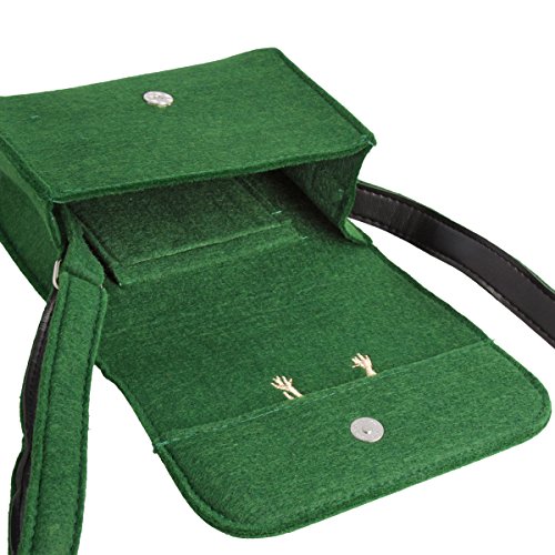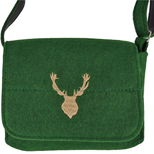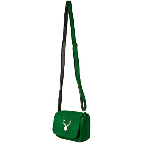 Dirndl Filz Umhängetasche mit dezenter Hirschgeweih-Verzierung in Gold besticht mit ihrer klassischen, leicht abgerundeten Form und praktischen Finessen wie z. B. verstellbarer und mit Kunstleder gestärkter Tragegurt, verdeckter Druckknopfverschluss, integriertes Innenfach Diese geräumige Trachtentasche bietet ausreichend Platz für viele Utensilien und erweist sich als praktischer Oktoberfest-Begleiter. Solche Alltagsgegenstände wie Geldbeutel, Handy, Taschentücher, Schlüssel usw. können leicht im Inneren dieser Filz Dirndl Handtasche platziert werden. Der leistungsstarke versteckte Druckknopfverschluss gewährt sicheren Transport des Inhaltes. Im kleinen integrierten Innenfach könnten Sie Ihren Ausweis, Kredit- oder Eintrittskarte verstauen und ersparen sich somit das lange Suchen danach. Der 140cm lange verstellbare Trageriemen ermöglichst optimale Anpassung der Umhängetasche an Ihren Körper und sorgt somit für hohen Tragekomfort und angenehmes Tragegefühl. Dank einfarbiger Ausführung lässt sich diese Trachten Handtasche mit vielen anderen Farben und Dirndl Modellen harmonisch kombinieren. Dabei entscheiden Sie selbst, ob Sie diese Tasche zu einem unauffälligen Wiesn-Begleiter oder einem optischen Highlight. Produktdetails: Material: Filz und Kunstleder Gewicht: ca.100 g Außenmaße: BxHxT: 18 x 15 x 7 cm Innenfach: BxH 10 x 8 cm Trageriemen: 140 cm lang, gestärkt und verstellbar in der Länge Verschlussart: verdeckter Druckknopfverschluss Verzierung: dezente Hischgeweih-Verzierung in Gold