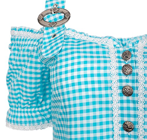 Karierte trachtige Carmenbluse mit weißer Spitze und Metallknöpfen verziert. Die Träger sind mittels Schnalle verstellbar. Ein weiteres Highlight ist die Schnürung im Rückenbereich, mit der sich die Bluse individuell an jede Figur anpassen läßt. Schulterfrei, durch Träger mit dekorativen Metallschnallen verstellbar Puffärmel durch eingenähten Gummizug Mit Spitzenbordüre an Halsausschnitt, Ärmeln und Knopfleiste Halsausschnitt und Knopfleiste zusätzlich mit schöner Borte und Rüsche verziert Schöne traditionelle Metallknöpfe Material: 55% Baumwolle, 45% Polyester Pflegehinweise: 30 Grad Maschinenwäsche, bügelbar