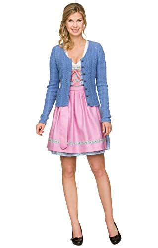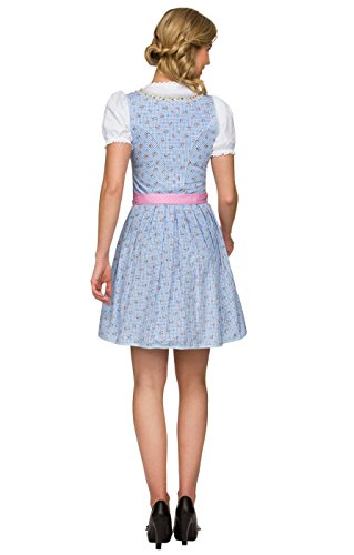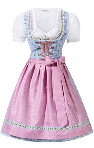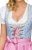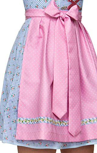 Traumhaftes Minidirndl für den perfekten Wiesnauftritt. Hellblau und rosa sind die dominierenden Farben des jugendlichen, zweiteiligen Minidirndls Naomi hellblau mit einer Rocklänge von 50 cm. Mieder und Rock zeigen ein kleines Karomuster in Hellblau und Weiß, das mit rosafarbenen Streublümchen bedruckt ist. Im Brustbereich ist das Modell mit einem Zipper sowie einer rosa Bändchenschnürung geschmückt. Letztere wird durch silberfarbenen Miederhaken mit floralem Design gehalten. Die rosafarbene Schürze mit den zarten weißen Pünktchen fügt sich perfekt ein und vermittelt ein harmonisches Gesamtbild. Passend zur verspielten Optik des Dirndls ist auch der tiefe Ausschnitt, den eine Blümchenborte sowie eine zarte Spitze rahmt. Diese Borte findet sich auch am unteren Rand der Schürze wieder.