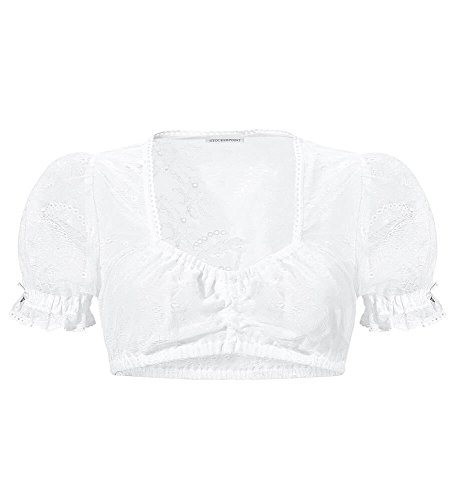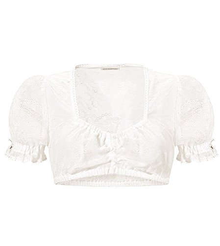 Die cremefarbende Dirndlbluse B7170 mit Herzausschnitt hebt das Dekolleté besonders anmutig hervor. Hals- und Schulterpartie werden eingerahmt und mit einer feinen Bordüre verziert. Die Bluse ist vorne leicht gesmokt und wird nicht geöffnet. Rückenpartie und Puffärmel sind aus transparenter Spitze gefertigt. Mit einer Materialmischung aus Baumwolle und Polyester ist die leichte Bluse angenehm zu tragen. Dabei ist sie absolut pflegeleicht. Die Dirndlbluse B7170 ist übrigens mit allen Modellen aus der Kollektion von Stockerpoint kombinierbar.