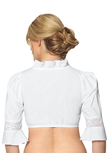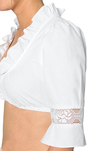 Eine tolle Form, die sich zu nahezu zu jedem Dirndl kombinieren lässt und ihm eine neue Optik gibt. Romantisch gerüschter Ausschnitt der sich dezent um Hals und Nacken legt. Halb langer Arm mit breiter Filethäkelei und kleinem Volant-Bündchen, auch mal für kühlere Tage. Die Bluse bietet sich für festliche als auch für sportive Dirndl an. Die Form des Ausschnittes ist durch ein Bändchen individuell regulierbar.
