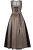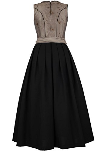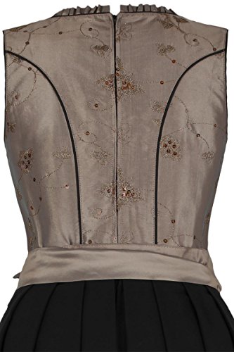 Dieses tolle und auffallende Dirndl in schillerndem Braun kleidet Sie zu jedem Anlass perfekt. Das lange Dirndl besteht aus einem schwarzen Rock und einem im schillernden Braun gearbeiteten Oberteil. Das Oberteil ist reichlich verziert mit einer floralen, braunen Stickerei in die braune Pailletten eingearbeitet sind. Die Abnäher sind alle in Schwarz gehalten. Der Ausschnitt des Dirndls ist mit einer Rüschenbordüre aus braunem, schillernden Stoff eingefasst. Die Zierschnürung ist aus braunen und schwarzen Stoffbändern und die Miederhacken sind aus jeweils zwei metallenen Rosen gearbeitet. Das Dirndl verfügt über eine braune Schürze, die aus dem gleichem Stoff gearbeitet ist wie das Oberteil. Geschlossen wird das Dirndl hinten mit einem Reißverschluss. Auf der rechten Seite ist eine Einschubtasche in den Rock eingearbeitet.