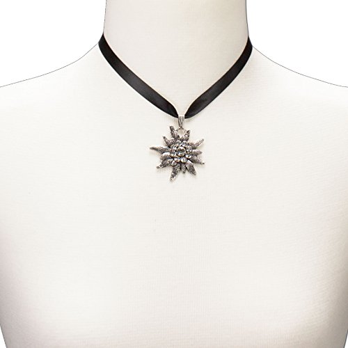 Die Trachtenkette ist aus einem Satinband gefertigt und hat einen schönen, großen Strass-Edelweiss-Anhänger.