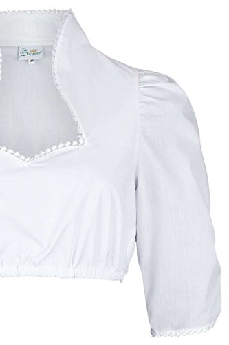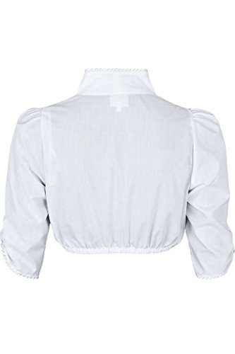 Produktinformationen: Diese schlichte und doch sehr elegante Bluse der Marke Stoiber ist sehr vielseitig kombinierbar. Die Bluse ist mit einem herzförmigen Ausschnitt und einem Stehkragen ausgestattet. Am Halsausschnitt und rund um den Stehkragen ist eine Bordüre in Kugelform angebracht. Der Abschluss der ¾ Ärmel ist ebenfalls mit einer Kugelbordüre geziert und mit einem Gummizug leicht hoch gerafft. Am Saum verfügt die Bluse über einen Gummizug.