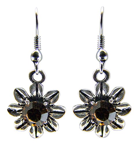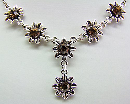 Beim Kauf dieser filigran gearbeiteten Halsketten mit passenden Ohrhängern machen Sie garantiert nichts verkehrt! Diese Schmucksets gibt es in vielen verschiedenen Farben und die Auswahl wird Ihnen sicher nicht leicht fallen. Wir haben passend zu Ihrem Kleid aber ganz sicher auch die richtige Farbe. Die Schmucksets passen wunderschön zu romantischen Dirndln, Trachten, Sommerkleidern und sind natürlich auch für festliche Anlässe geeignet. Die Colliers sind mit schön gearbeiteten Blütenblättern versehen, je ein glitzernder Strass-Stein ziert die einzelne Blüte. Die Ohrringe sind als Hänger gearbeitet und passen perfekt zur Kette. Durch die klaren, frischen Farben ist dieser Halsschmuck ein echter Hingucker.Hersteller: TrachtenlandLieferumfang: Halskette und 1 Paar OhrhängerMaterial: Modeschmuck / MetallMaße: Länge: ca. 41 cm + 7 cm VerlängerungsketteLänge der Ohrringe : ca. 3 cm – Durchmesser der Blumen: ca. 1 cmIn vielen verschiedenen Farben erhältlich.