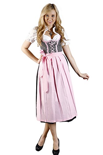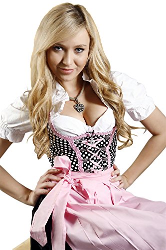 Schwarz kann mit so ziemlich jeder Farbe kombiniert werden. Hier hat man sich für ein zartes Rosa entschieden, welches als Schürze einen besonderen Blickfang setzt. Dieses Rosa findet sich auch in den filigranen Borten wieder, die am Oberteil eingearbeitet sind. Sie erhalten die Schürze, das Kleid und auch die Bluse als komplettes Dirndl. Die feinen Satinbänder am Mieder unterstreichen die Fraulichkeit und machen dennoch einen mädchenhaften Auftritt perfekt. Die Gummibänder an den Ärmeln und der feine Stoff garantieren einen Tragekomfort, der den gesamten Tag und die ganze Nacht anhalten wird. Gehen Sie tanzen oder auf ein typisches Volksfest und lassen Sie sich mit einem Dirndl sehen. Marke: Trachtenpoint Produktart: Dirndl Farbe: Rosa Kleid-Länge: 130 cm Rock-Länge: 90 cm